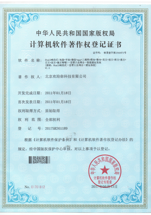 北京歡迎你科技有限公司獲得多項版權局"計算機軟件著作權登記證書",并已獲得“全國誠信經營示范單位”、“全國質量服務客戶滿意誠信企業”和“全國重合同守信用品牌企業”等榮譽稱號。